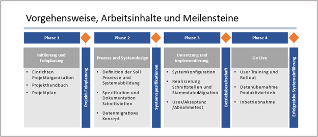 - Umsetzung und Implementierung (Systemkonfiguration, Realisierung Schnittstellen und Stammdaten-Migration, User-/Akzeptanz-/Abnahmetest)
